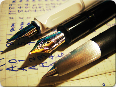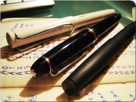 左上から「LAMY safari」、「Montblanc P146」、「LAMY2000」。それぞれ違う色のインクを入れてる。最近気がついたんだが、モンブランの146はoutlook expressの起動後の画面にも出てくる。